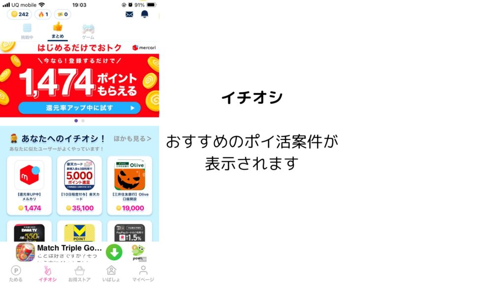 アプリの使用や会員登録案件のうち、特におすすめの案件が表示されます。