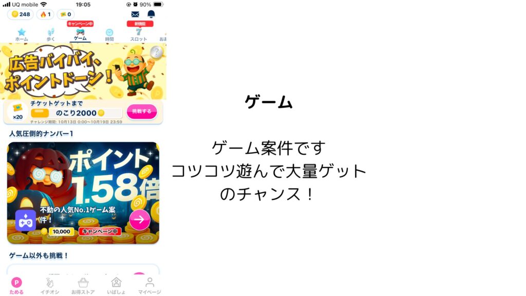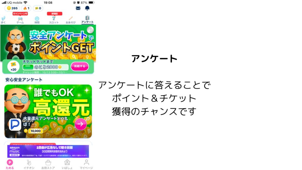 歩数系のアプリかと思っていましたが、ちょっとしたゲームやアンケートもあり意外と幅広い!