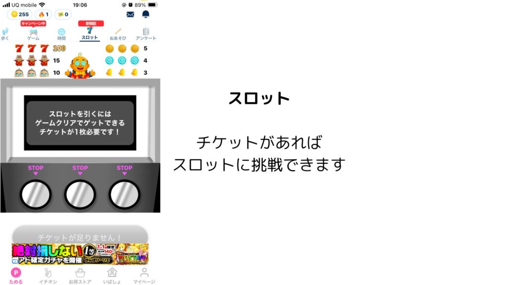 段階ごとにスロット用のチケットがゲットできる仕組みです。