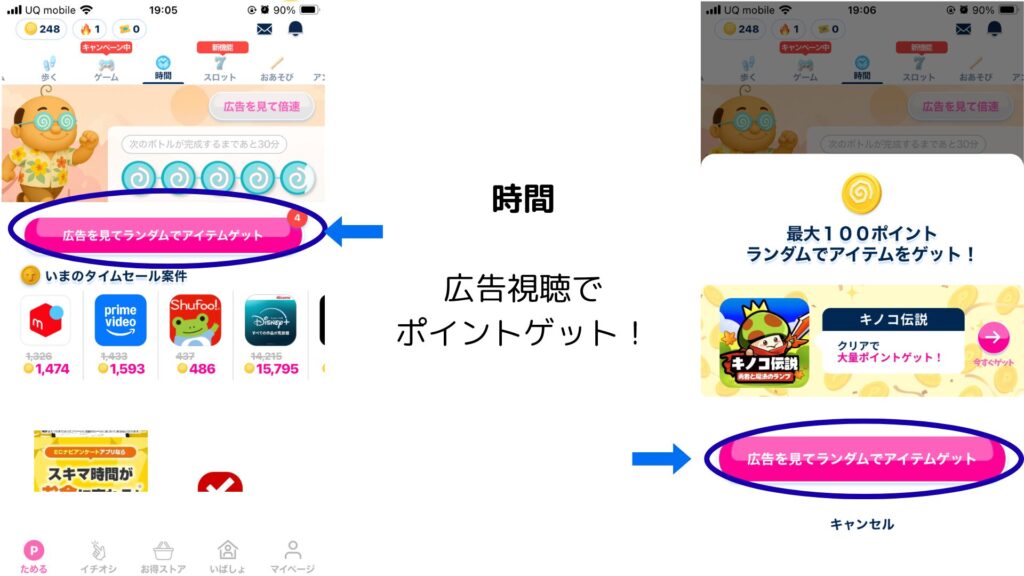 歩数だけでなく動画広告やゲーム案件、アンケートなどでも補助収入を得られる構成です。