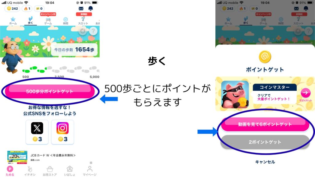500歩ごとに2ポイント、動画視聴で6ポイントです。