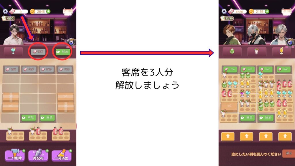 客席は、広告視聴と紙幣の消費で最大3つまで開けることができるので、
