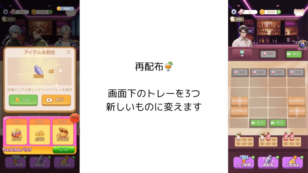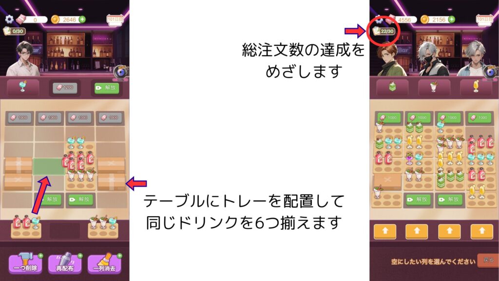 画面下にドリンクの乗ったトレーが3つずつ現れるので、