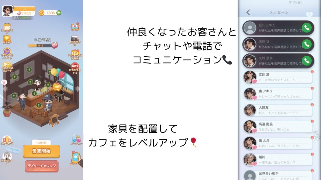 カフェのレベルアップや、男性客とのコミュニケーションで遊ぶこともできるゲームです。