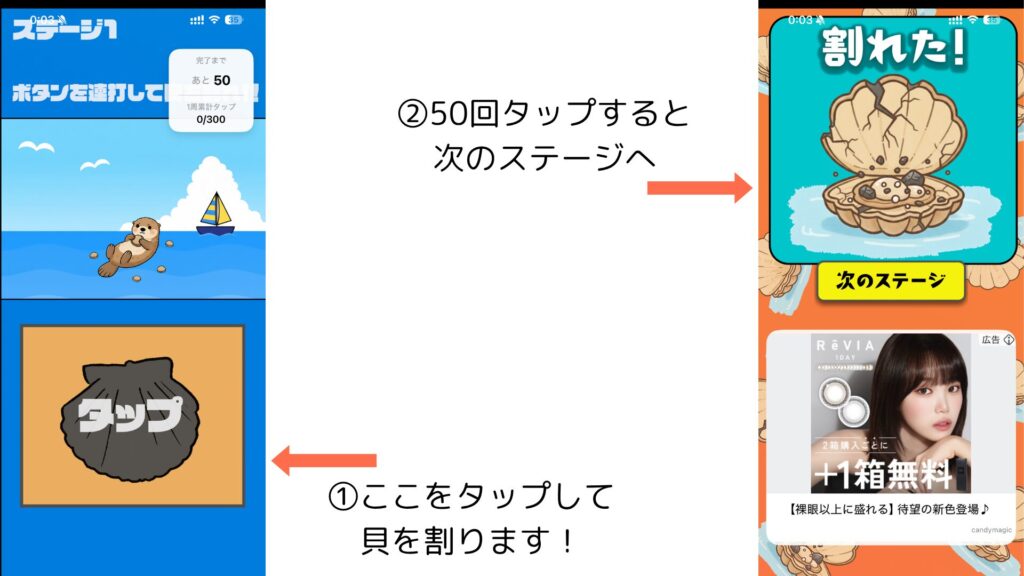 50回タップすると「割れた!」と表示され、貝が割れている画面に変わります。