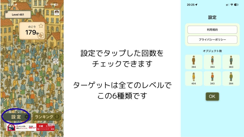 「設定⚙」で、見つけたターゲットの種類とタップした回数を確認することができます。