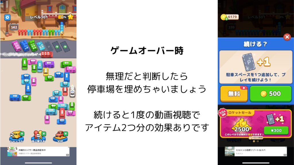 停車場が全て埋まってしまった場合はゲームオーバーになりますが、
