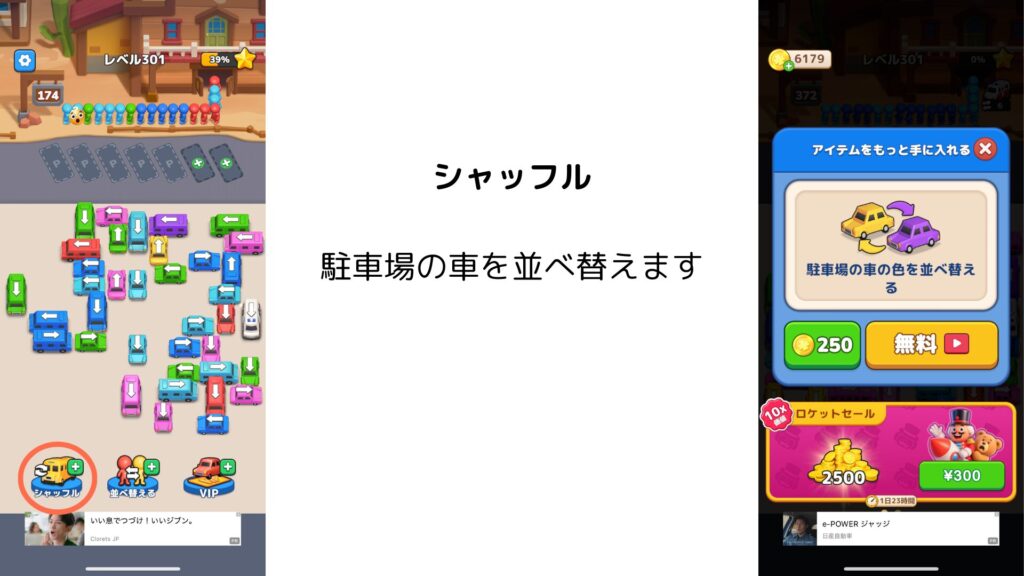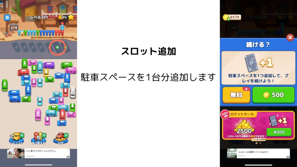 停車場の「⊕」をタップし、400コイン消費か広告視聴で使用可能です。