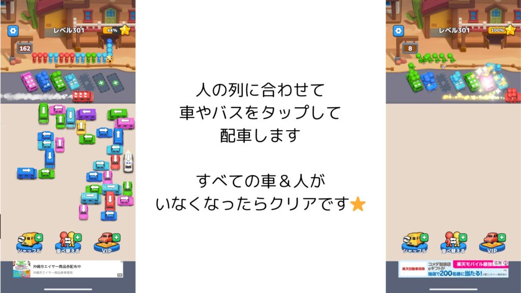 混雑した駐車場で車両やバスを効率よく操作してパズル状況を解決するモバイルゲームです。