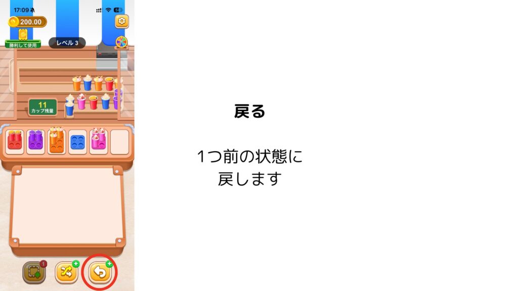 各レベルには目標のカップ数が設定され、限られたトレー置き場内での達成を目指します。