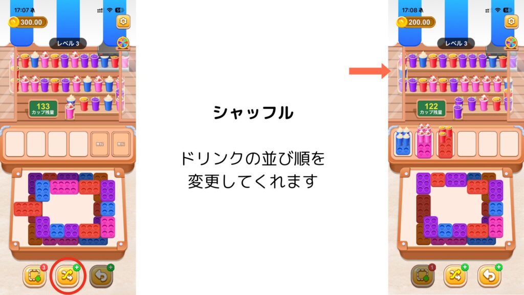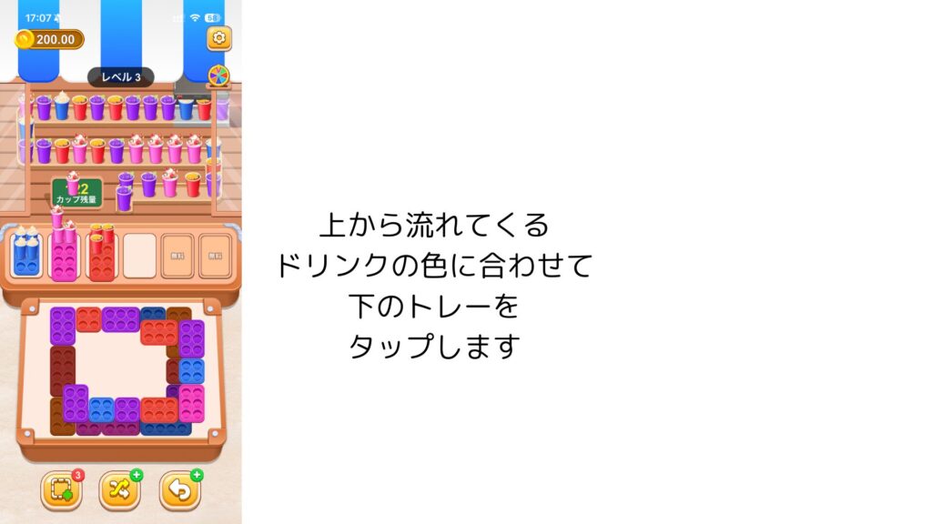 並んでいるドリンクの色に合わせて、トレーを選択していくゲームです🥤