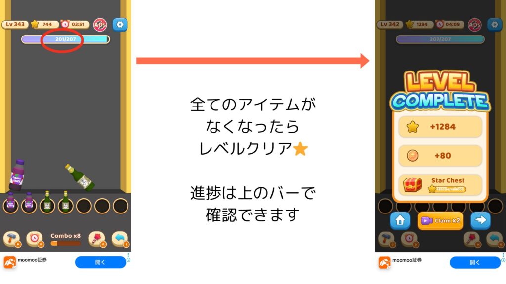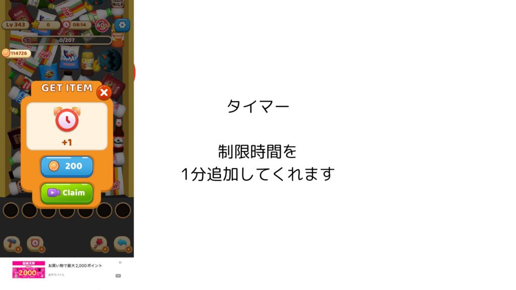 時間内にすべてのアイテムを消したらレベルクリアです。