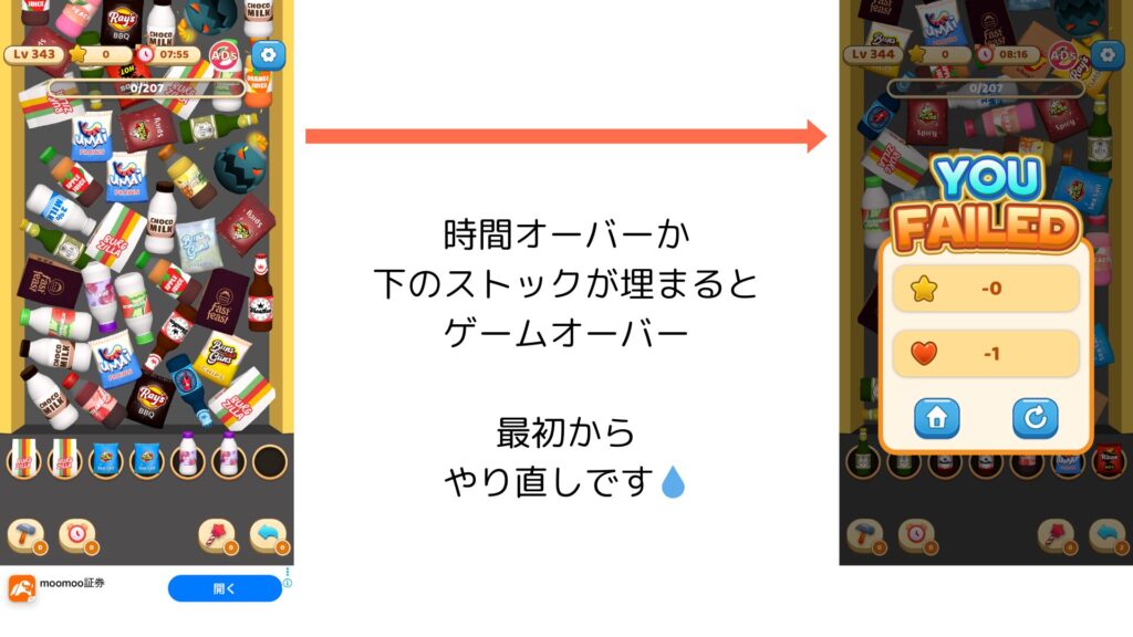 画面下のストック欄が全て埋まってしまったらゲームオーバーです。