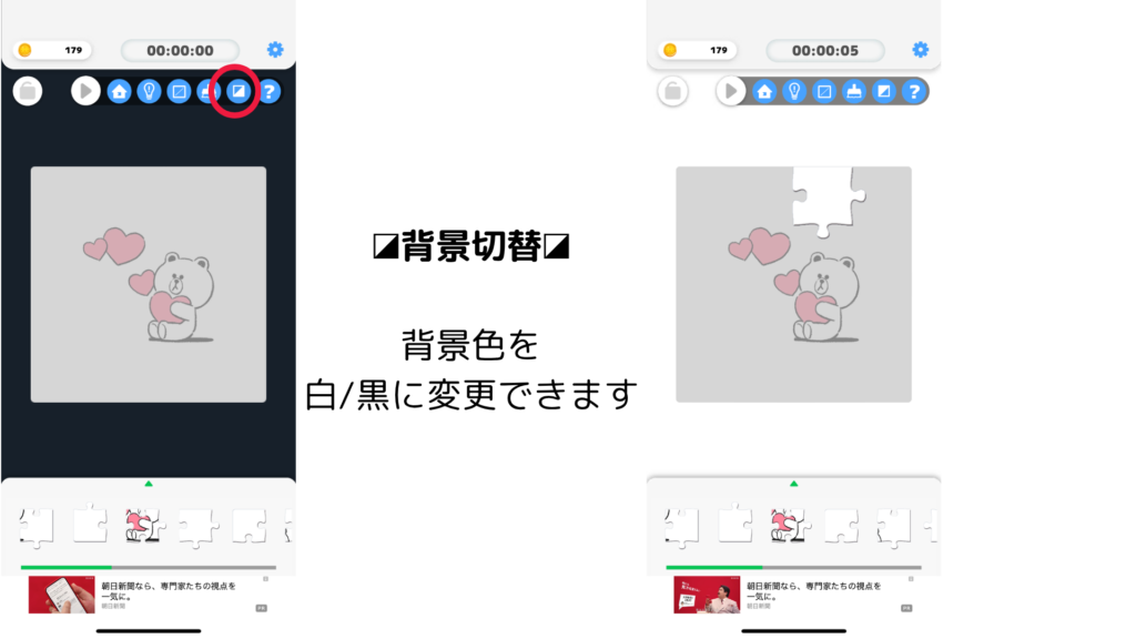 パズル外の背景色を白/黒に切り替えることができます。
