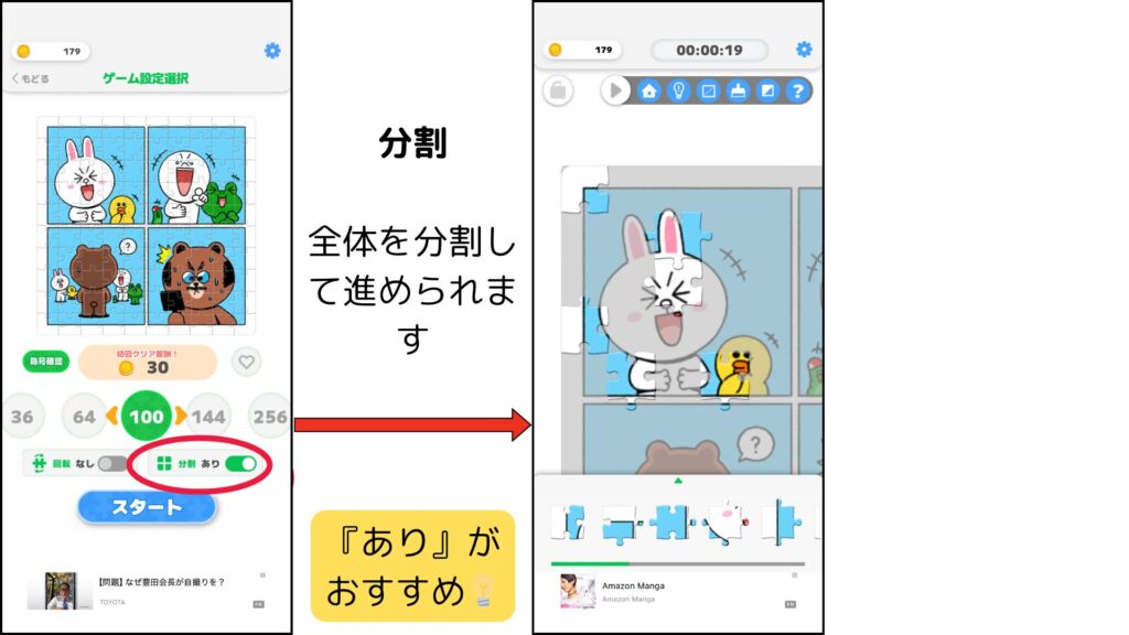分割を「あり」にしてプレイするのがおすすめです!