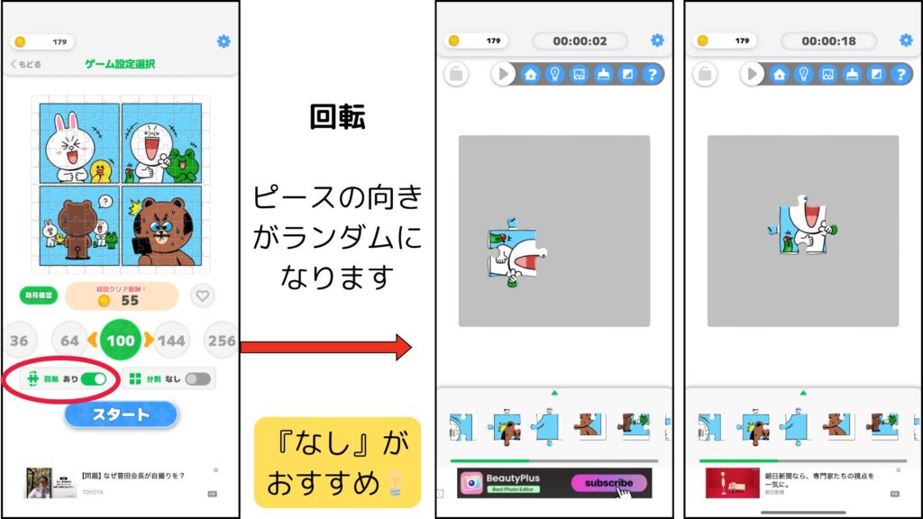 回転を”あり”にすると、ピースの向きがランダムになります。