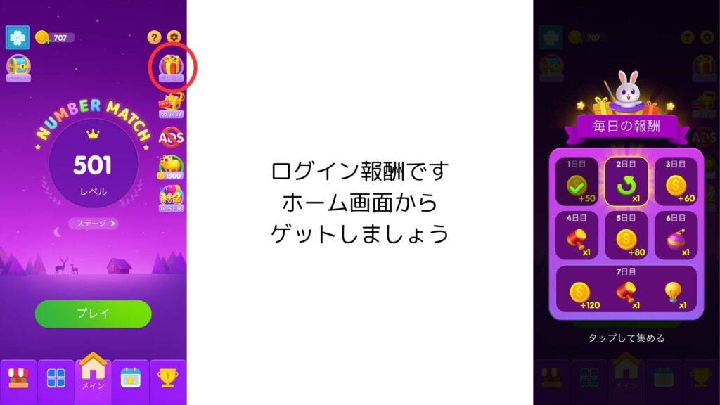 ホーム画面に戻ってログイン報酬のアイコンをタップしなければなりません。