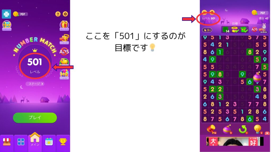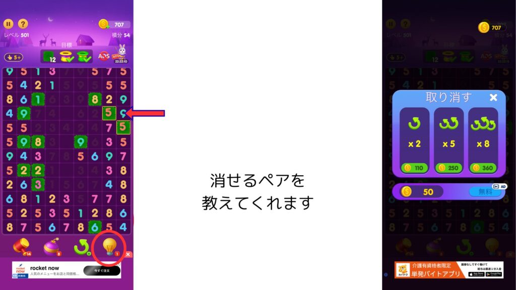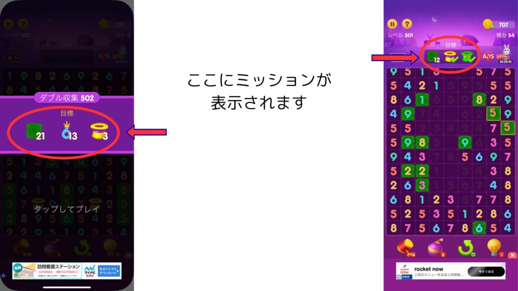 数字のペアを見つけてタップし、ミッションをクリアしていくゲームです。