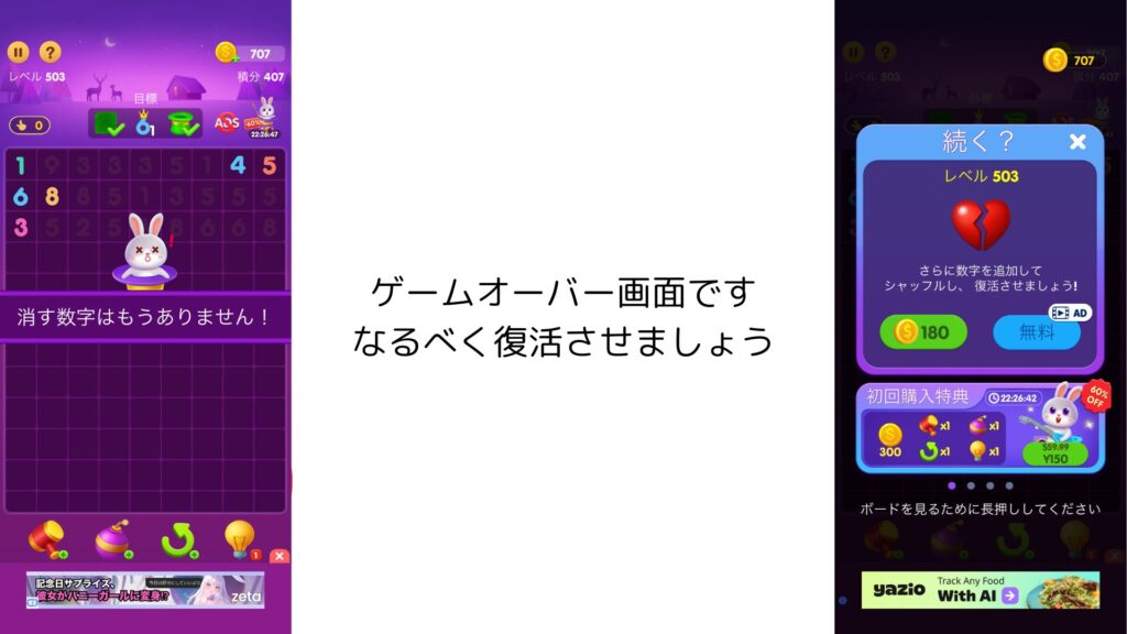 ミッションを残したまま、消せる数字のペアが無くなってしまったらゲームオーバーです💧
