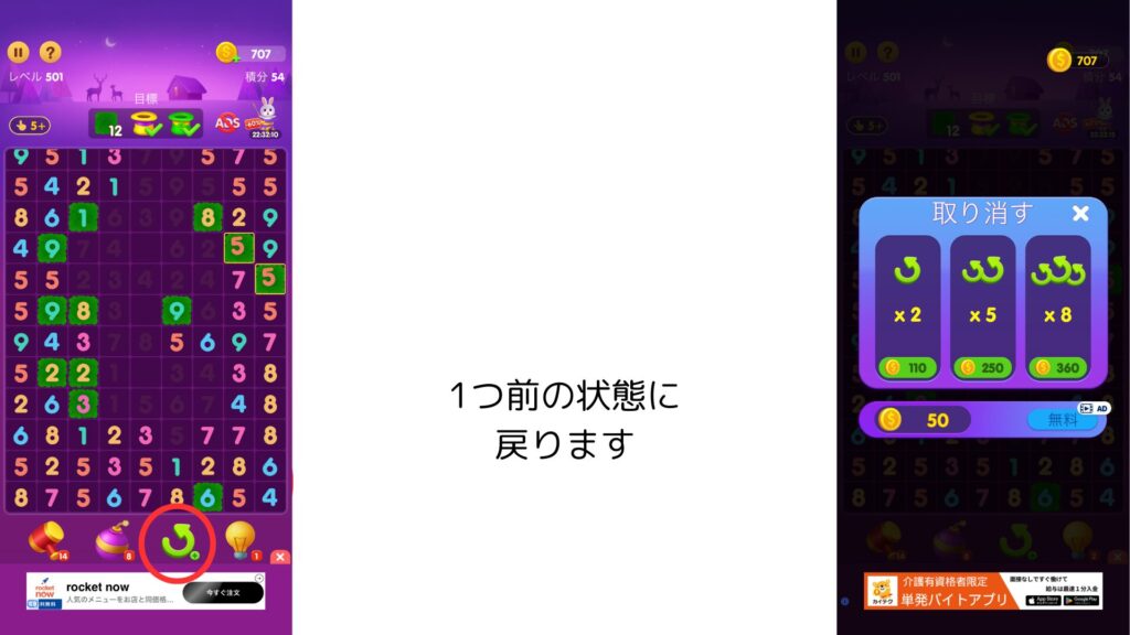 (例:3&3、2&8、4&6)を見つけてタップで消し、