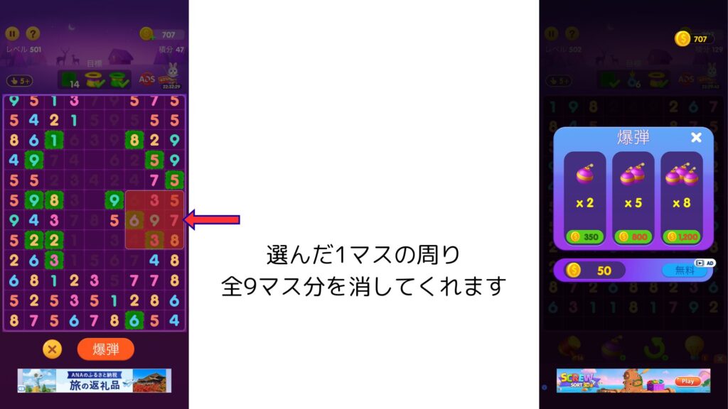 好きな場所を選んで、縦横斜め9マスをまとめて消すことができます。