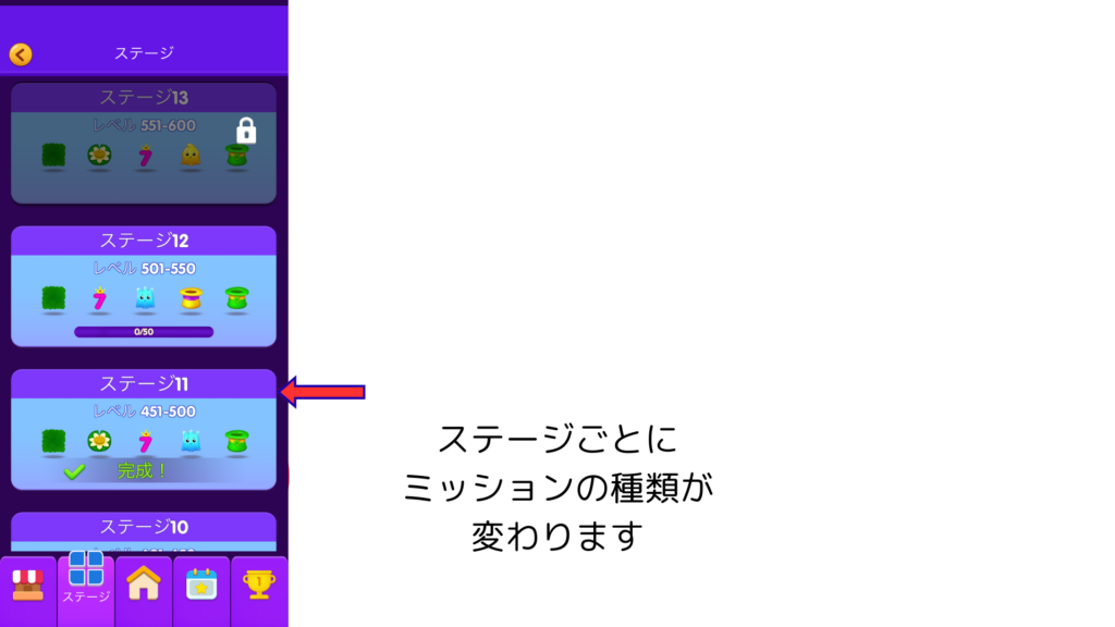 50レベルごとにステージが変わり、ステージごとに課されるミッションの種類が変わります。