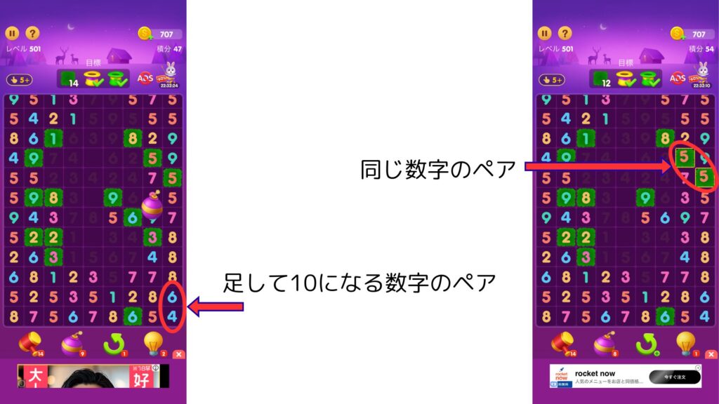消せる数字のペアは、「同じ数字」か「足して10になる数字」のどちらかです。
