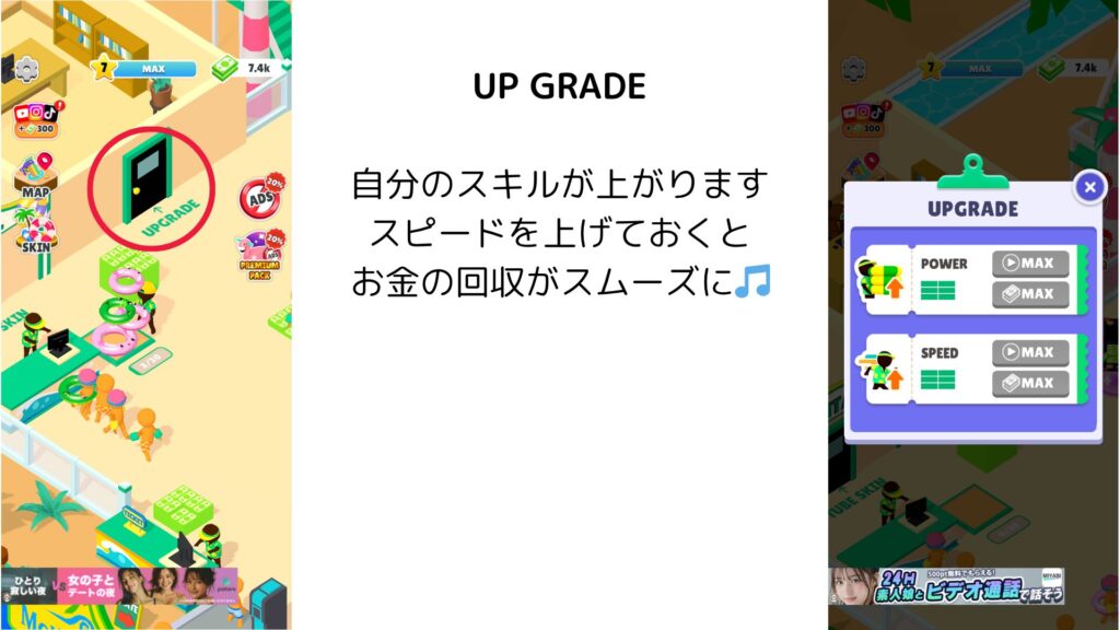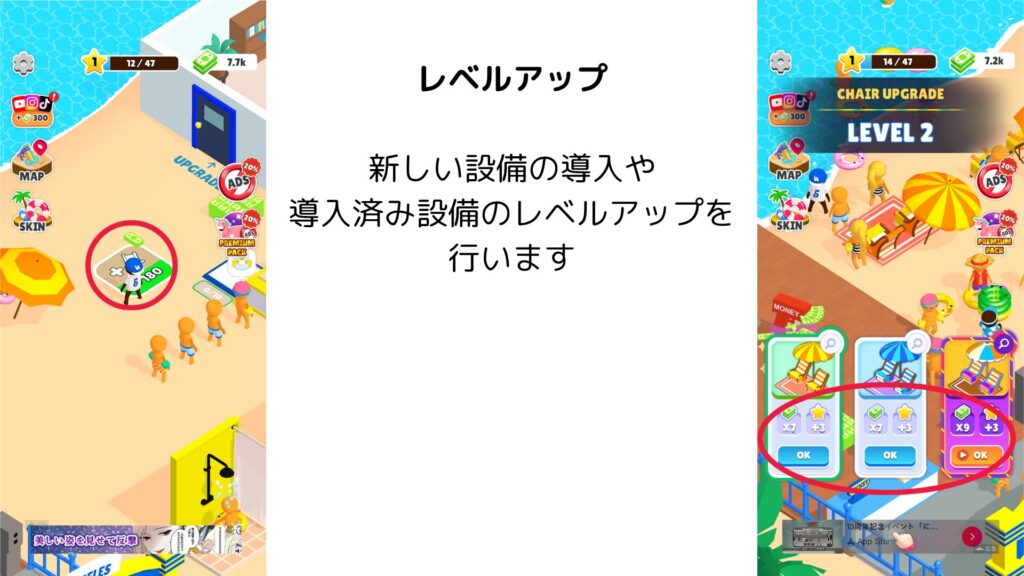 スライダーや遊泳エリアをタップで建設・アップグレードし、