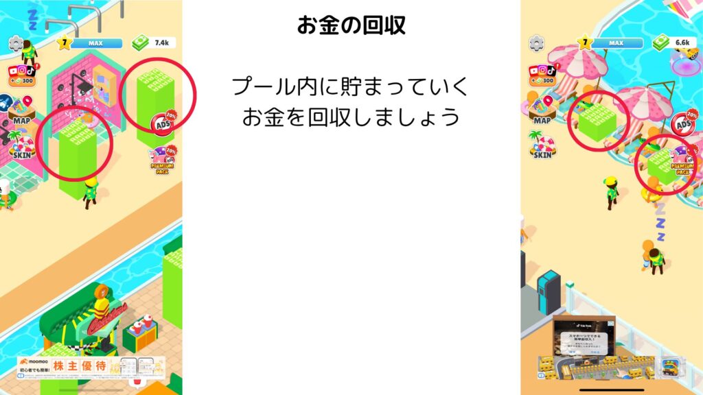 プール内をぐるぐる回ってお金を回収しましょう。